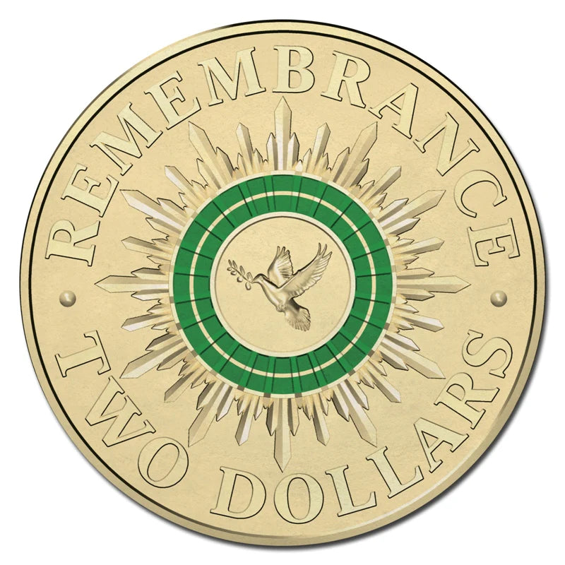 This coloured $2 Remembrance Day circulation coin features a centrally-sculpted design element of a dove in full flight carrying an olive branch - both recognised symbols of peace. The symbolic design was also inspired by the Australian Commonwealth Military Forces' original 'Rising Sun' badge.