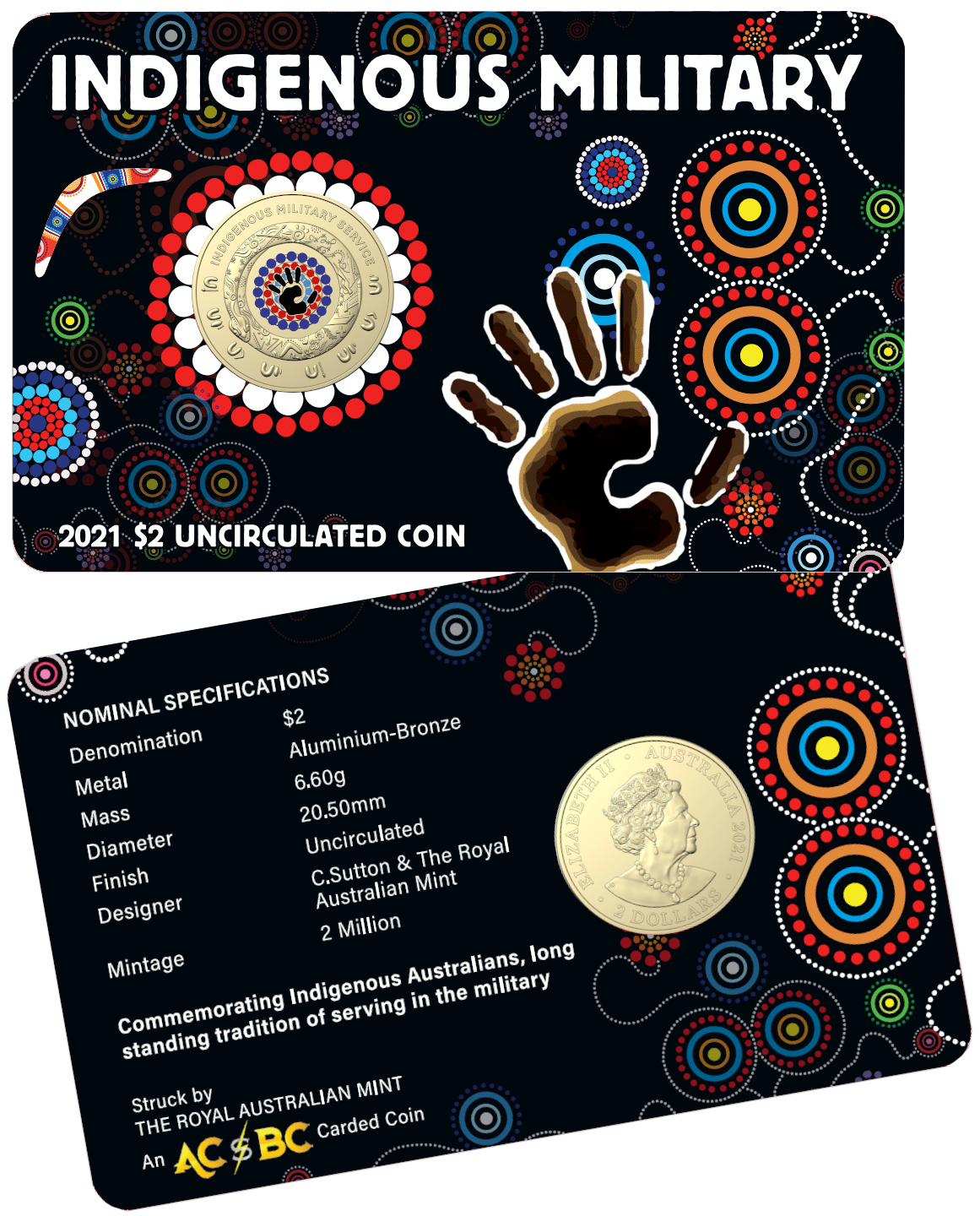 Inspired by the artwork of Chern’ee Sutton, the design of the coin is rich with Indigenous and military symbols that represent the Aboriginal and Torres Strait Islander people who have served in the Australian Defence Force.